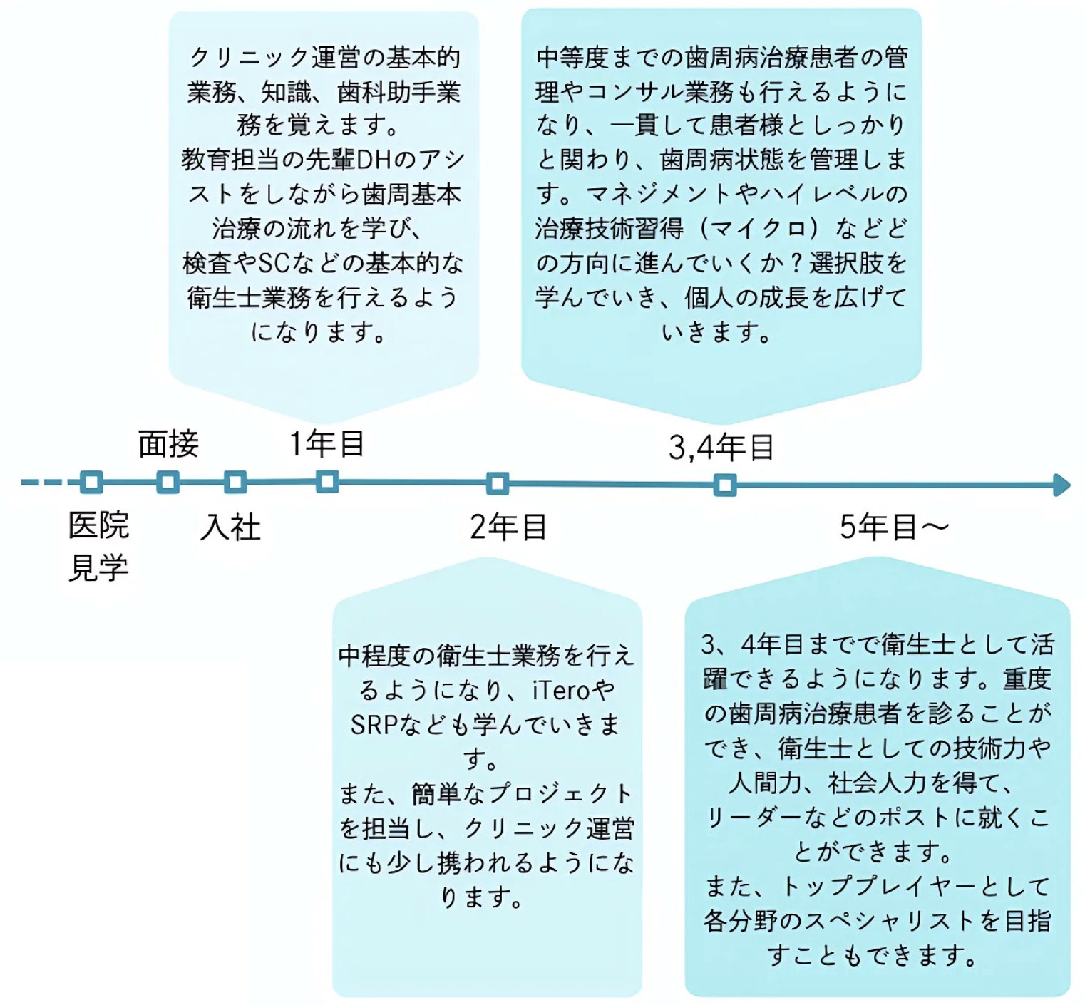 先輩のサポートを受けながら1〜2年で衛生士としての土台を作り、3年目ごろにはマネジメントやハイレベルの治療技術習得、様々な選択肢から個人にあった成長することができます。